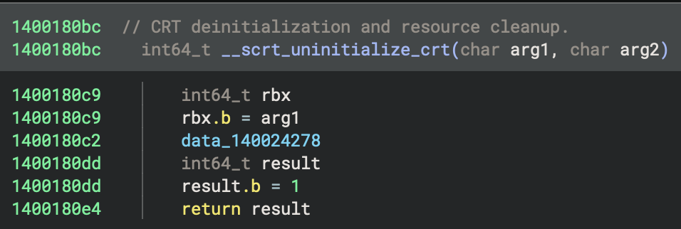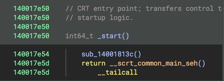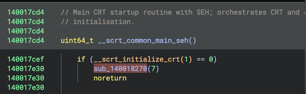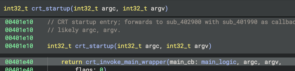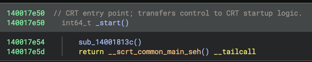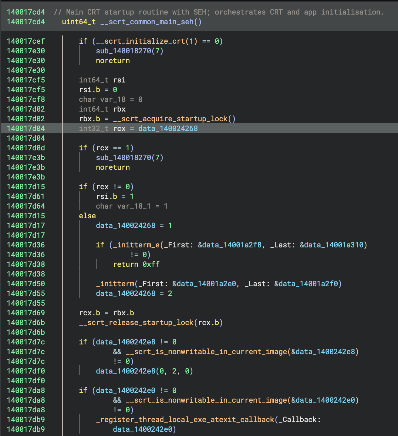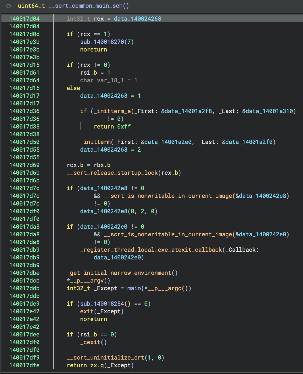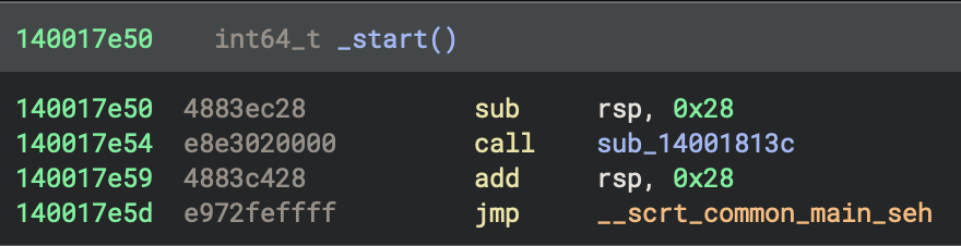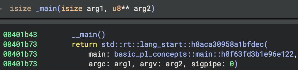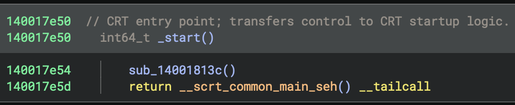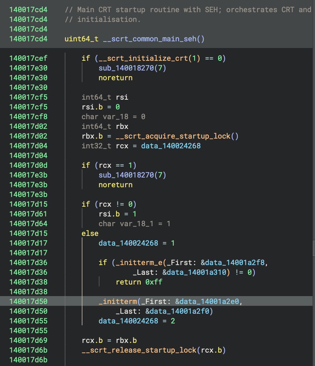 The wrapper function you see (main calling sub_140002520) is Rust-specific - it’s the Rust standard library’s runtime initialization that C doesn’t need.