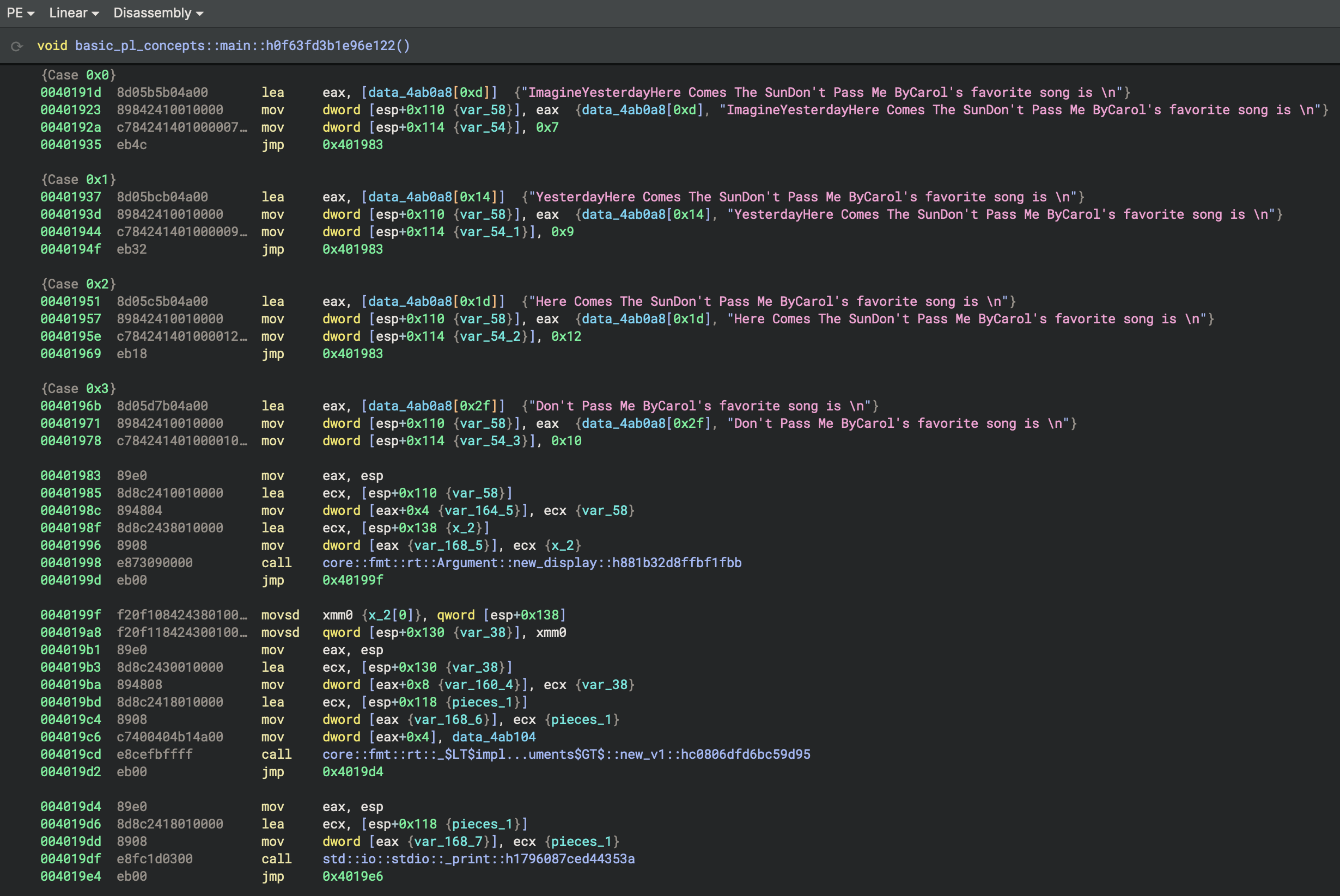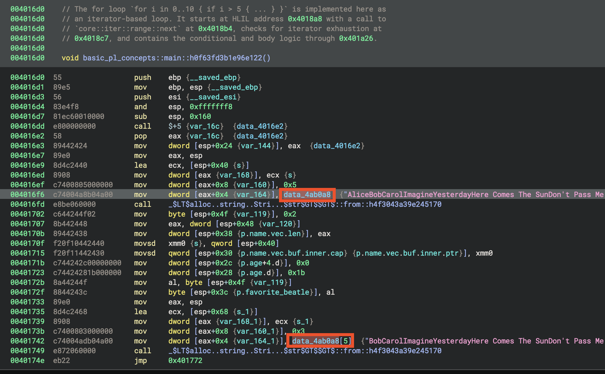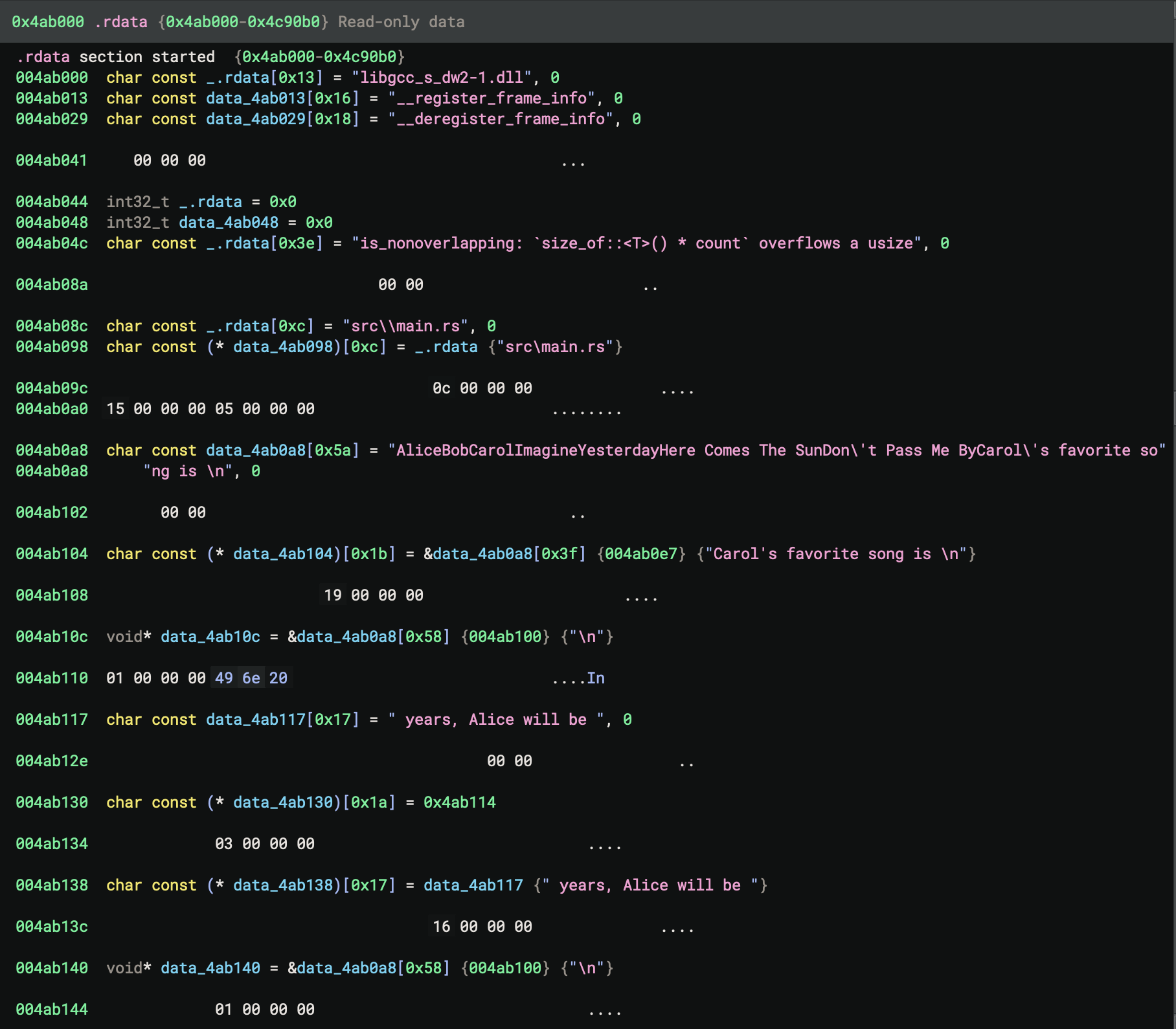 Hands-on analysis of basic Rust programming language concepts and their binary representations.
